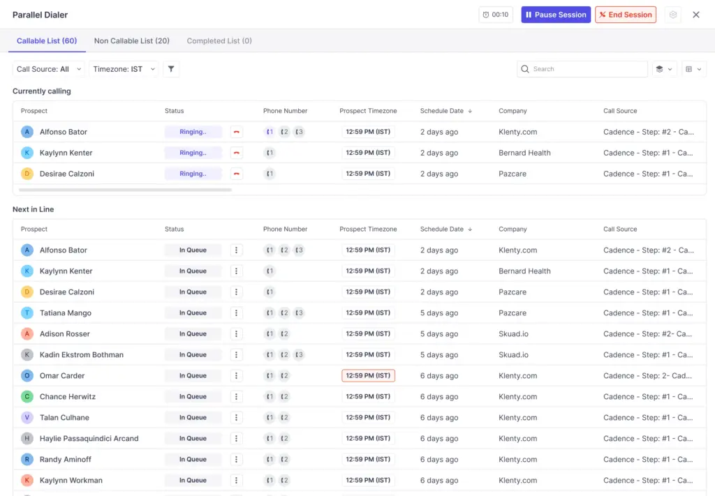 The AI Parallel Dialer lets you call multiple prospects at once (for example, up to five prospects simultaneously). This is a game-changer for high-volume outbound or when connect rates are low.