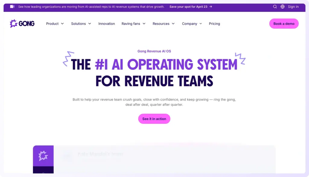 | Gong | Revenue intelligence, Conversation analytics, Deal risk alerts | Custom pricing | 4.7/5 |
