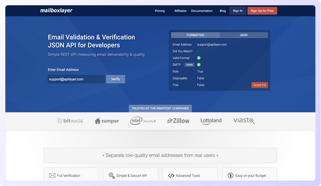 Based on REST, it is secured by 256-bit HTTPS encryption to help you with a fast and secure email verification.