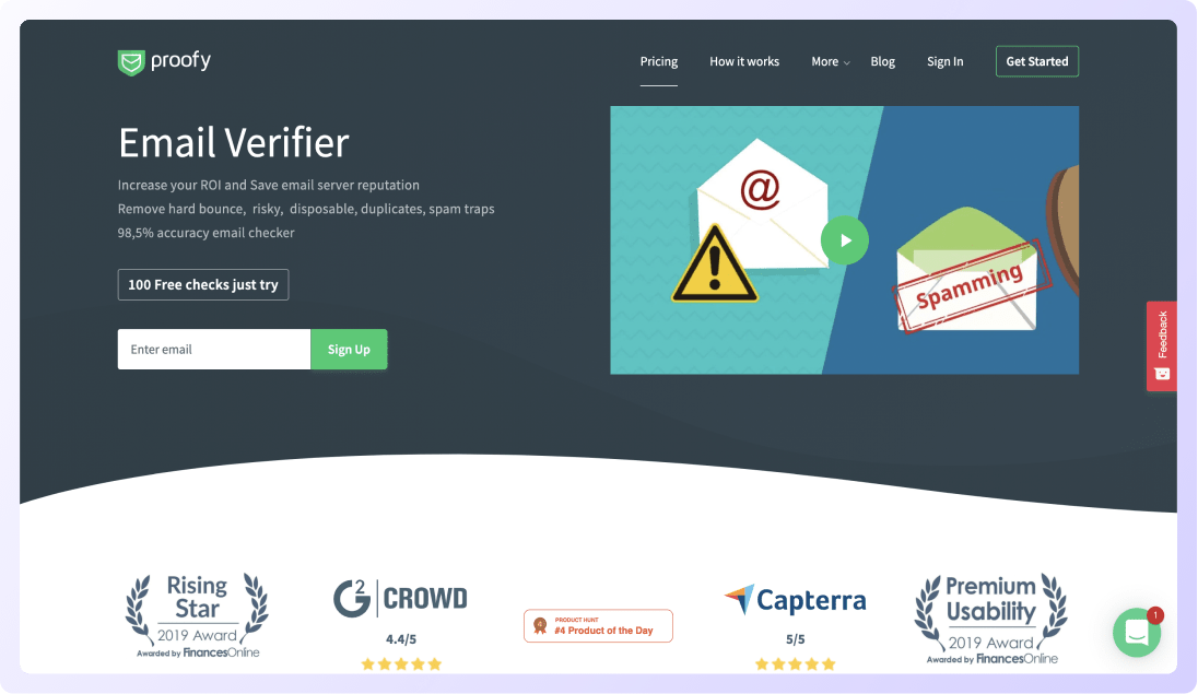 Proofy.io is a powerful email validation tool that helps you minimize bounces. It has an accuracy of over 96%.