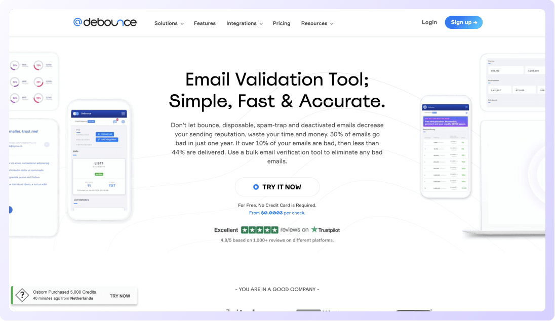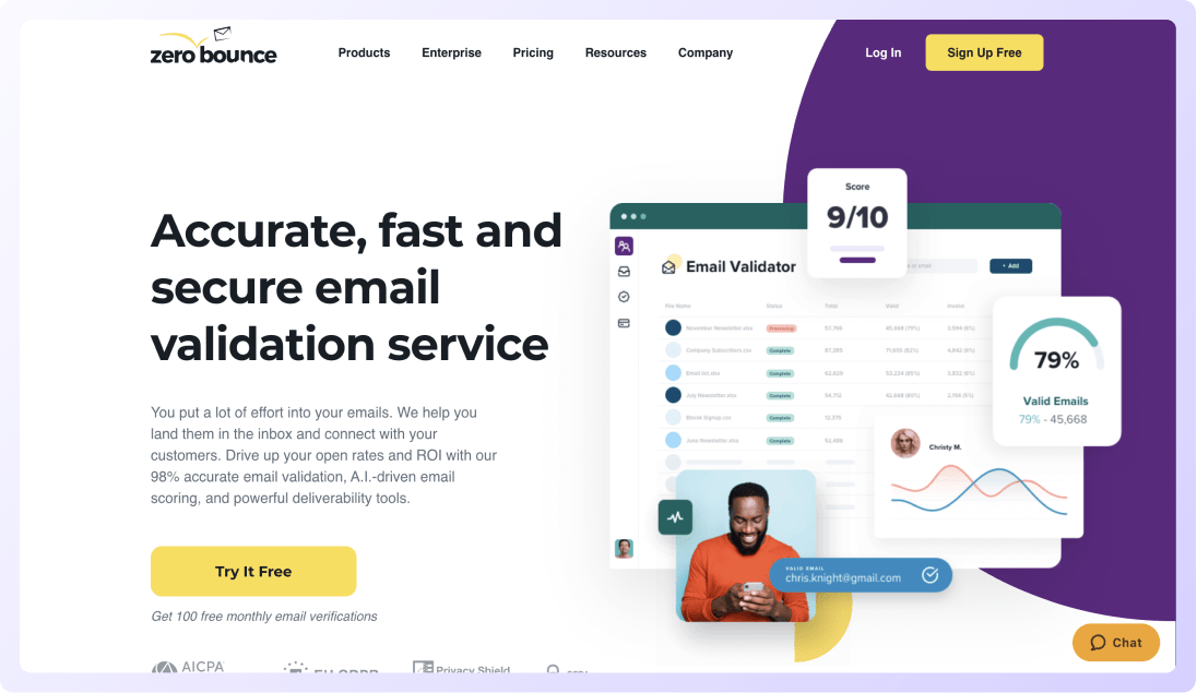 With over 100,000 users, Neverbounce is one of the top tools for validating emails addresses.