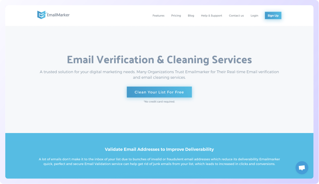 Start Free TrialEmailMarker is an email validation tool that helps you reduce bounces by validating email addresses. With the tool, you can verify a list of emails in different formats such as csv, xls, xlsx, txt as well as verify email addresses provided by website visitors, with their API.
